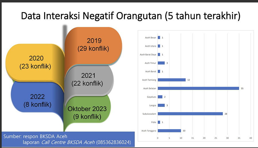 Balai Konservasi Sumber Daya Alam [BKSDA] Aceh mencatat, sejak 2019 sampai Oktober 2023 jumlah konflik manusia dengan orangutan mencapai 91 kasus. Rinciannya, 2019 [29 kasus], 2020 [23 kasus], 2021 [22 kasus], 2022 [8 kasus], dan Januari – Oktober 2023 [9 kasus].