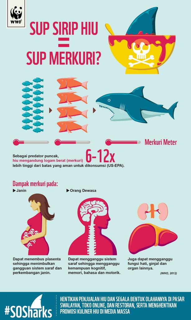 WWF, dalam salah satu pernyataannya mengungkapkan hal serupa. Sebagai pedator puncak, kandungan mercuri pada hiu jauh lebih tinggi 6-12 kali lipat lebih tinggi dari batas aman untuk dikonsumsi.