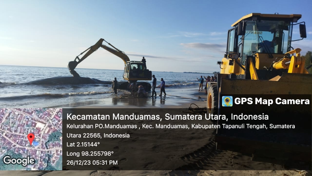 - Seekor paus sperma dengan panjang 16,5 meter, dan berat sekitar 25 ton terdampar di pesisir Pantai Sindeas, Kecamatan Manduamas, Kabupaten Tapanuli Tengah (Tapteng), Sumatera Utara (Sumut), Senin (25/12/2023).