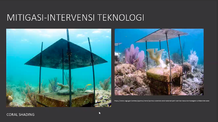 Sementara untuk mitigasi seperti mengurangi dampak kenaikan suhu, praktiknya di Indonesia belum banyak. Namun di luar negeri ada yang melakukan penurunan suhu dengan penyemprotan artificial cloud. Cara lain, menurut Abrar, di Florida ada yang memberikan naungan (shading) di atas terumbu karang bawah laut.