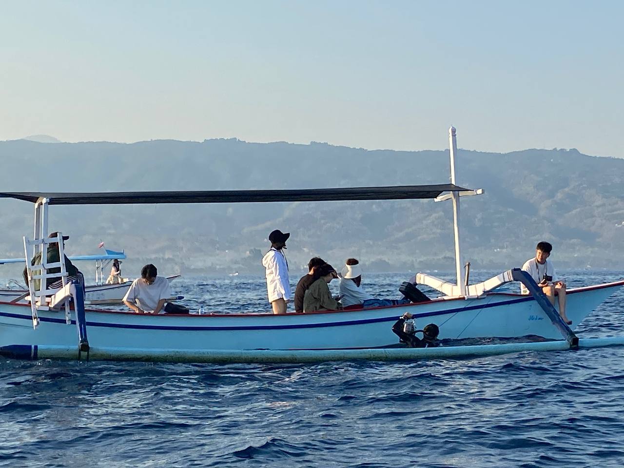 Sang kapten terdengar memberi isyarat kemunculan lumba-lumba sehingga kedua turis harus bersiap dengan kameranya mengarah ke bawah laut untuk merekam gerakan lumba-lumba di bawah mereka.