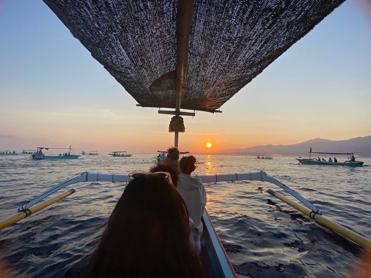 Perjalanan naik jukung ini tanpa ngebut mengikuti lumba-lumba sudah menenangkan mata. Turis bersiap pukul 05.30 sebelum matahari muncul. Jelang sampai titik habitat mamalia lucu itu, berkas cahaya matahari biasanya sudah memendar jingga, sampai bulat sempurna.