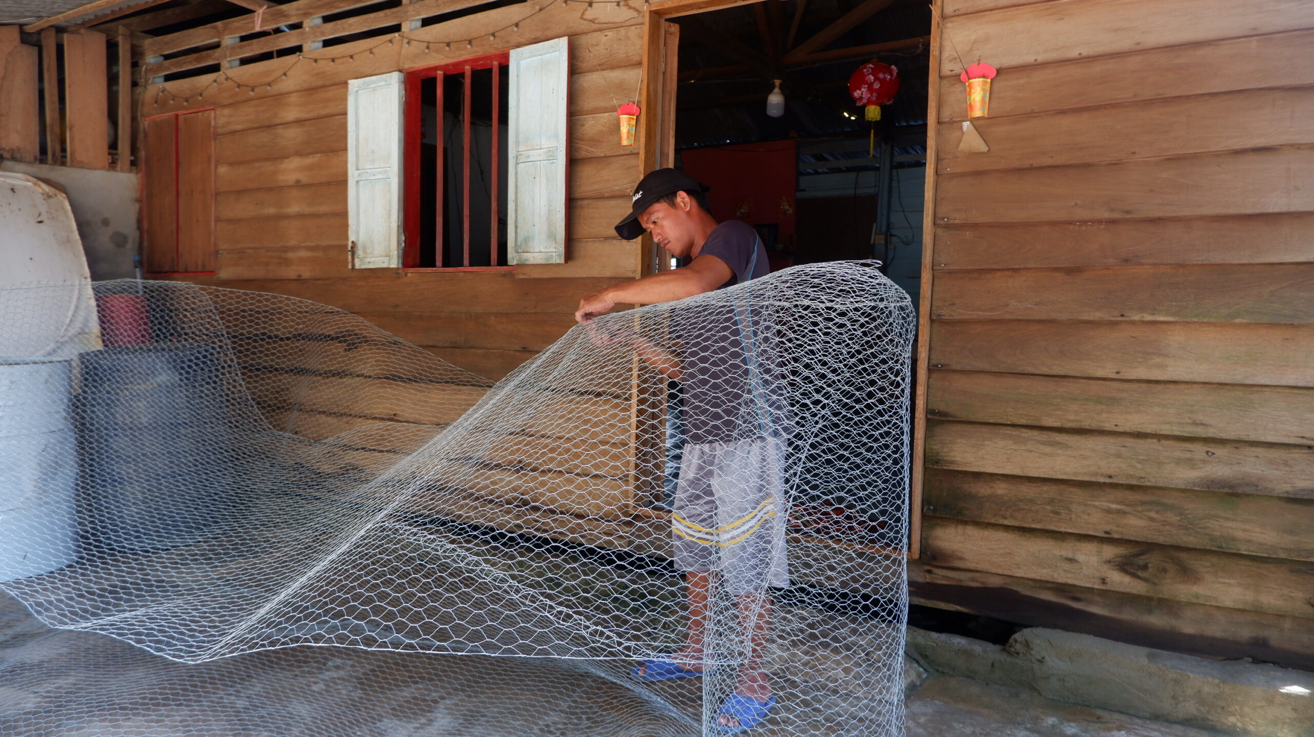 Kegembiraan itu terlihat saat mereka merajut alat tangkap ikan dingkis berbentuk kawat putih persegi panjang. “Ini namanya alat tangkap kelong,” kata Hidayat, seorang nelayan Pulau Nguan yang sedang merajut perangkap kelong di teras rumahnya.