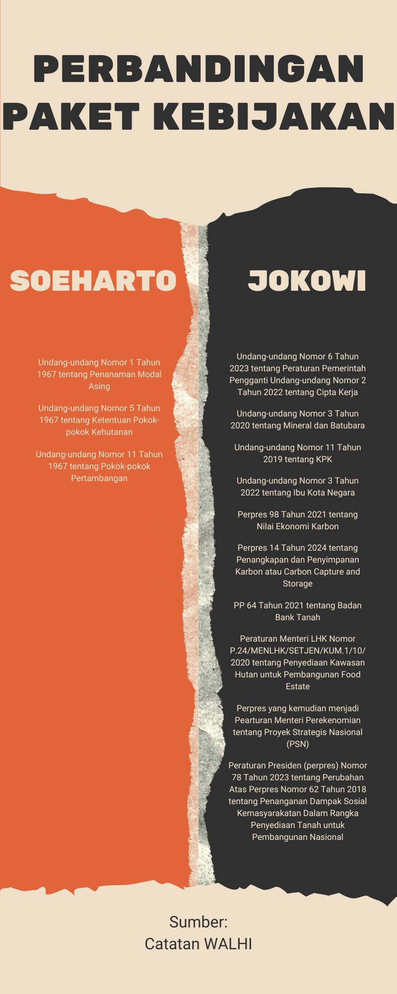 Hal ini terlihat dari jumlah paket kebijakan yang mendorong penerbitan izin di era Soeharto hanya terdiri dari tiga Undang-undang. Sementara dalam 10 tahun pemerintahannya, Jokowi menelurkan 11 regulasi dalam bentuk Undang-undang, peraturan pemerintah, hingga peraturan menteri yang menjadi dasar penerbitan izin yang mengorbankan kawasan hutan.