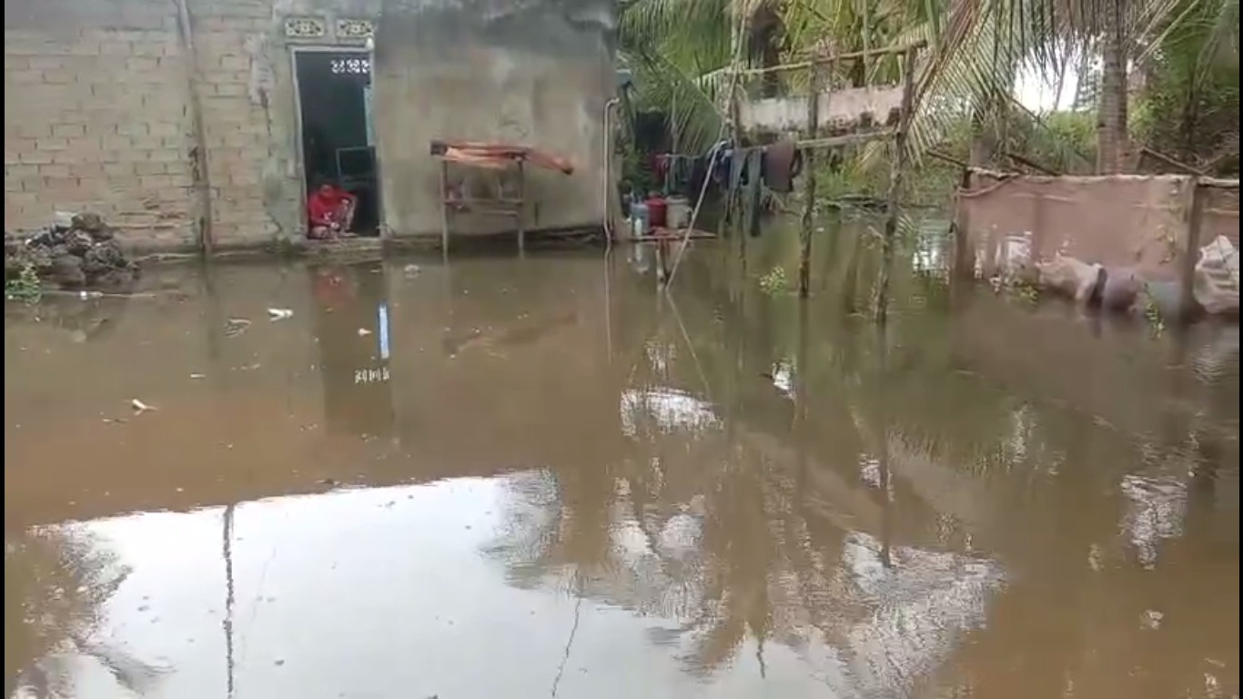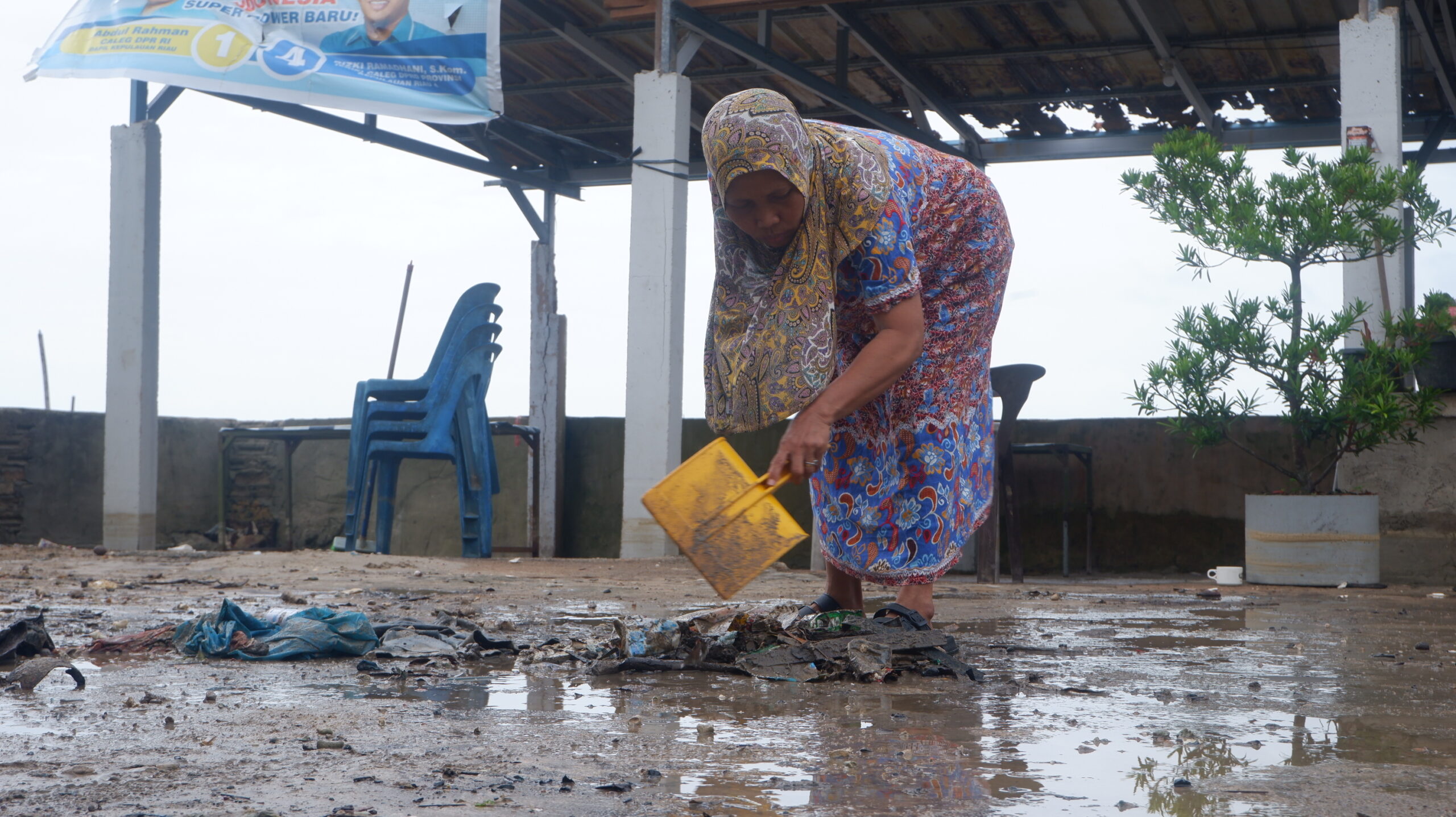 Saat ditemui satu jam setelah kejadian, Sarifah sedang membersihkan lumpur dan sampah yang naik ke halaman rumahnya. Nampak jelas di dinding rumahnya bekas genangan air banjir rob masih tersisa. “Air setinggi betis saya inilah,” katanya.