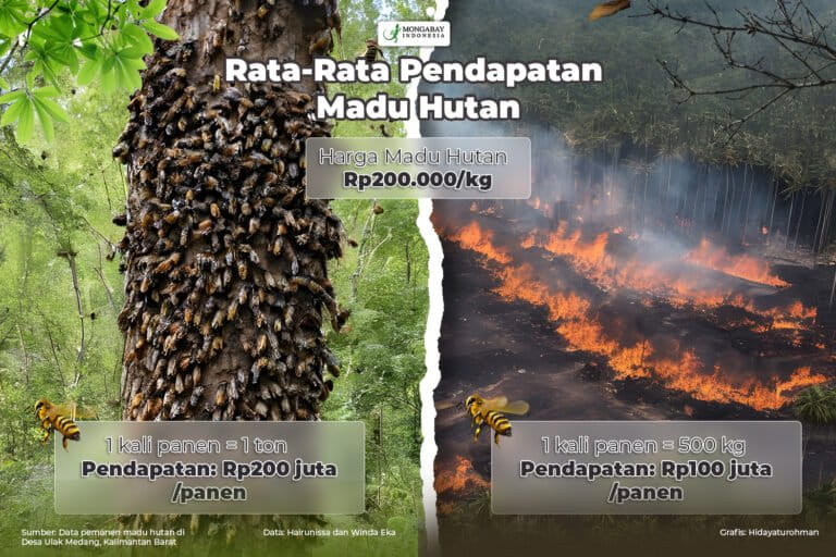 Rudianto, pemanen madu juga mengatakan, karhutla tahun 2019 menjadi mimpi buruk baginya. “Puluhan hektar lahan habis, madu yang dipanen hanya kurang dari 20 kg,” kata lelaki 53 tahun ini. Padahal, sebelumnya, dia bisa panen sampai ratusan kilogram.