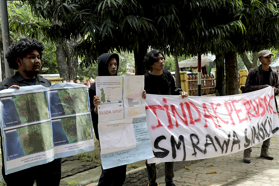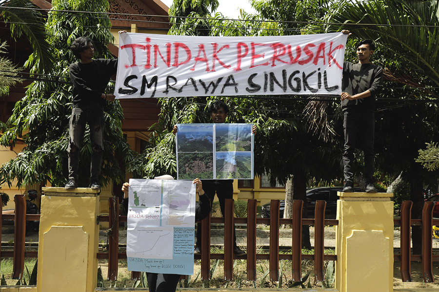 Mahasiswa yang tergabung dalam Aliansi Keadilan Lingkungan [AkaL], Kamis [7/3/2024], melakukan unjuk rasa di Kantor Balai Konservasi Sumber Daya Alam [BKSDA] Aceh.