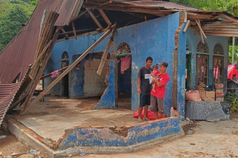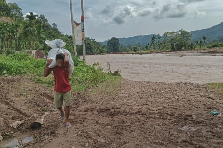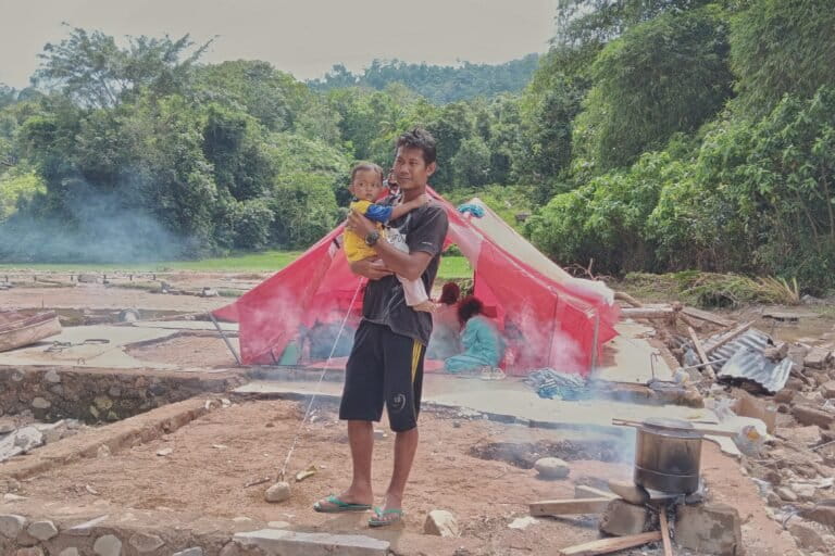 Raim Putra, rumahnya rata jadi tanah di Langgai bersama Ayu, istri dan satu anaknya mengungsi ke desa lain ke rumah keluarga. “Semua habis, tinggal baju yang menempel di badan,” katanya.