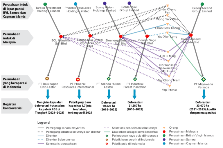 Struktur korporasi yang kompleks ini, katanya, pada dasarnya menyembunyikan pemilik manfaat utama korporasi dan melindungi mereka dari risiko hukum dan reputasi atas penghancuran hutan tropis yang begitu besar itu.