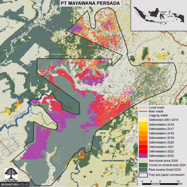 Sejak 2021-2023, Mayawana membersihkan hutan alam lebih 33.000 hektar atau seluas hampir setengah ukuran Singapura. Angka itu menyumbang lebih dari seperempat deforestasi di ratusan konsesi perkebunan kayu pulp dan sawit di seluruh nusantara.