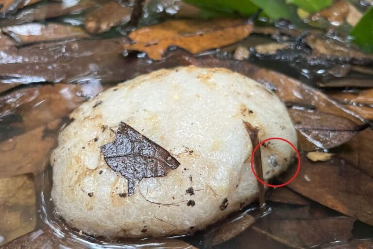 Saat menyusuri hutan sekunder di Hutan Harapan juga ditemukan telur katak pohon jam pasir yang mengapung di banjir akibat luapan sungai Lalan. “Biasanya telur ini ada di daun serasah atau tanah. Karena banjir, dia mengapung tapi telurnya belum menetas,” ujar Musadat, tim susur sungai Lalan dari Hutan Harapan.