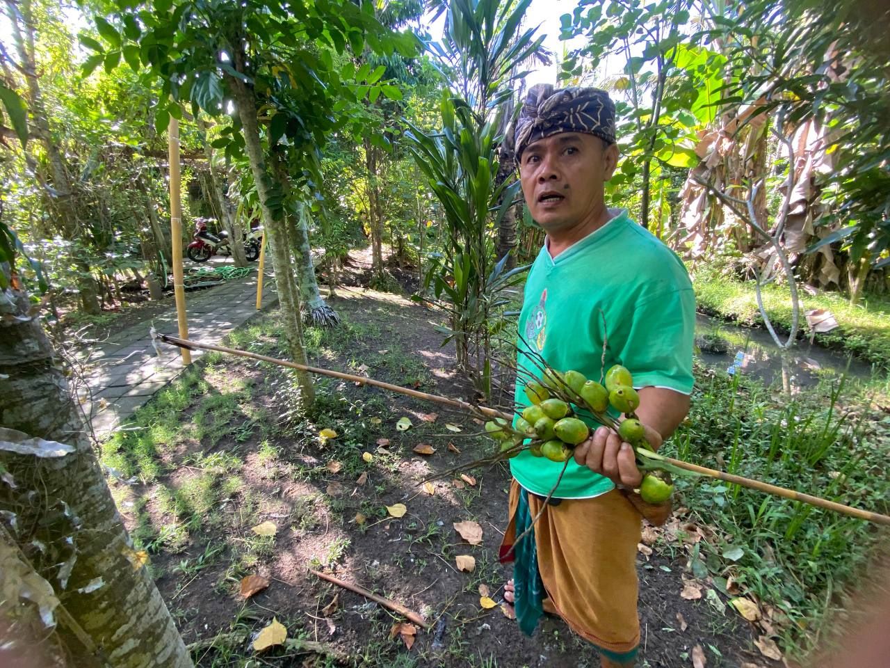 manusia dengan Tuhan, antar manusia, dan alam,” katanya. Sejumlah bibit pernah disumbangkan sebuah komunitas dan ditanam di area sumber air desa serta rumah warga yang masih memiliki lahan untuk tanaman besar. Misalnya pohon Bila, Cemara Bali, Sokasati, Nagasari, Kelapa Bulan,