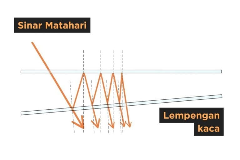 - Setiap pantulan cahaya antara dua lapisan kaca yang tidak sejajar menghasilkan citra “matahari” tambahan, dengan intensitas cahaya yang semakin berkurang seiring bertambahnya jumlah pantulan.