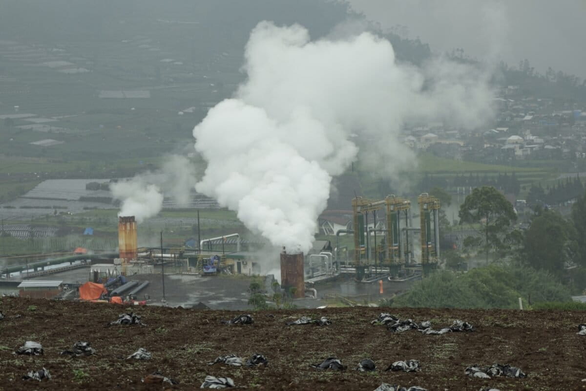 Foto utama: Kepulan asap dari wellpad panas bumi di Desa Kepakisan, dataran tinggi Dieng. Doc. CELIOS.