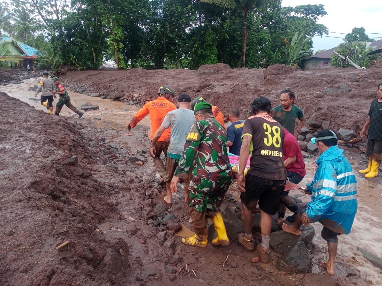 - Tim SAR gabungan dibantu warga masih melakukan pencarian korban lain yang hilang dengan cara menggali lumpur dan material batu yang menenggelamkan rumah warga, termasuk di sekitar bantaran kali.