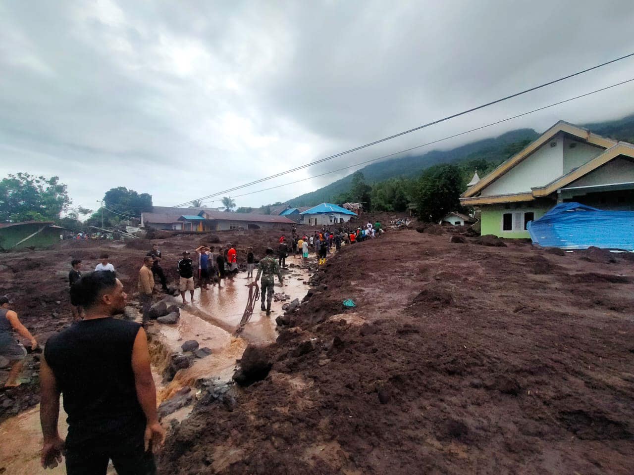 Kurang lebih seratus meter ke arah barat dari jalan raya di kelurahan itu, lumpur bercampur material batu menutup rumah mencapai satu meter. Tidak itu saja berbagai material termasuk batang pohon dan batu batu ikut terbawa memenuhi rumah warga dan kali.