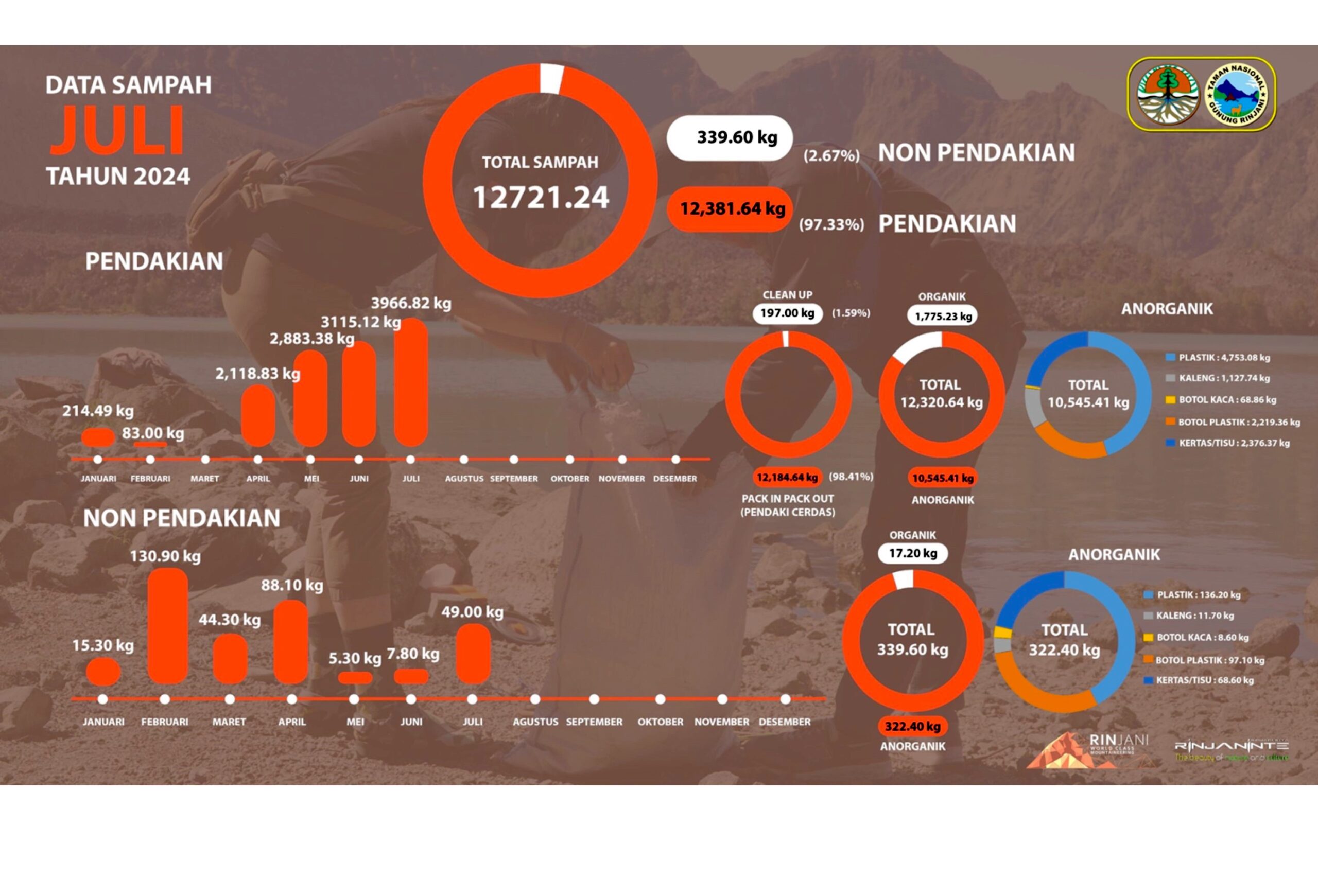 - Volume sampah yang dihasilkan dari Gunung Rinjani sebanding dengan jumlah kunjungan wisatawan. Pada Januari hingga Juli 2024, jumlah sampah yang dikumpulkan mencapai 12 ton. Masih kurangnya kesadaran pendaki membawa turun sampahnya.