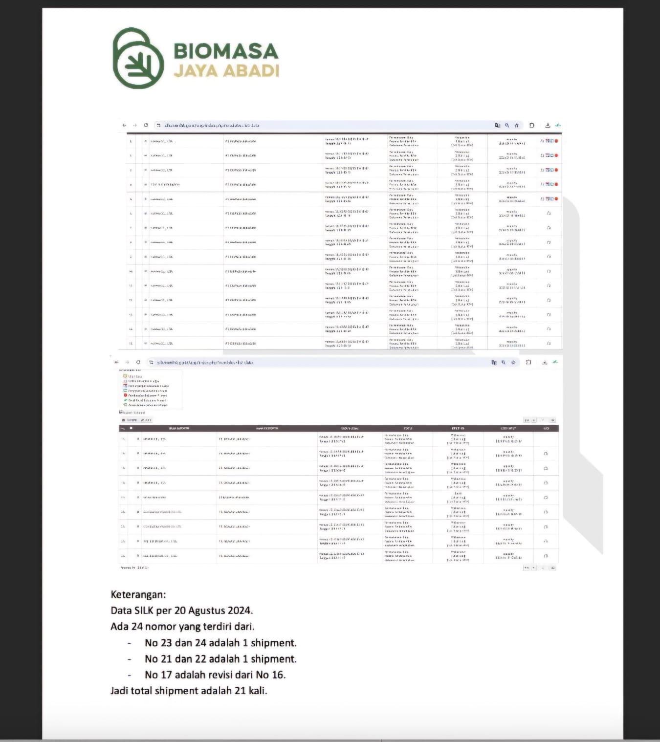 BJA juga melampirkan bukti catatan ekspor pelet kayu mereka yang tercatat dalam sistem informasi legalitas kayu (SILK) per 20 Agustus 2024.
