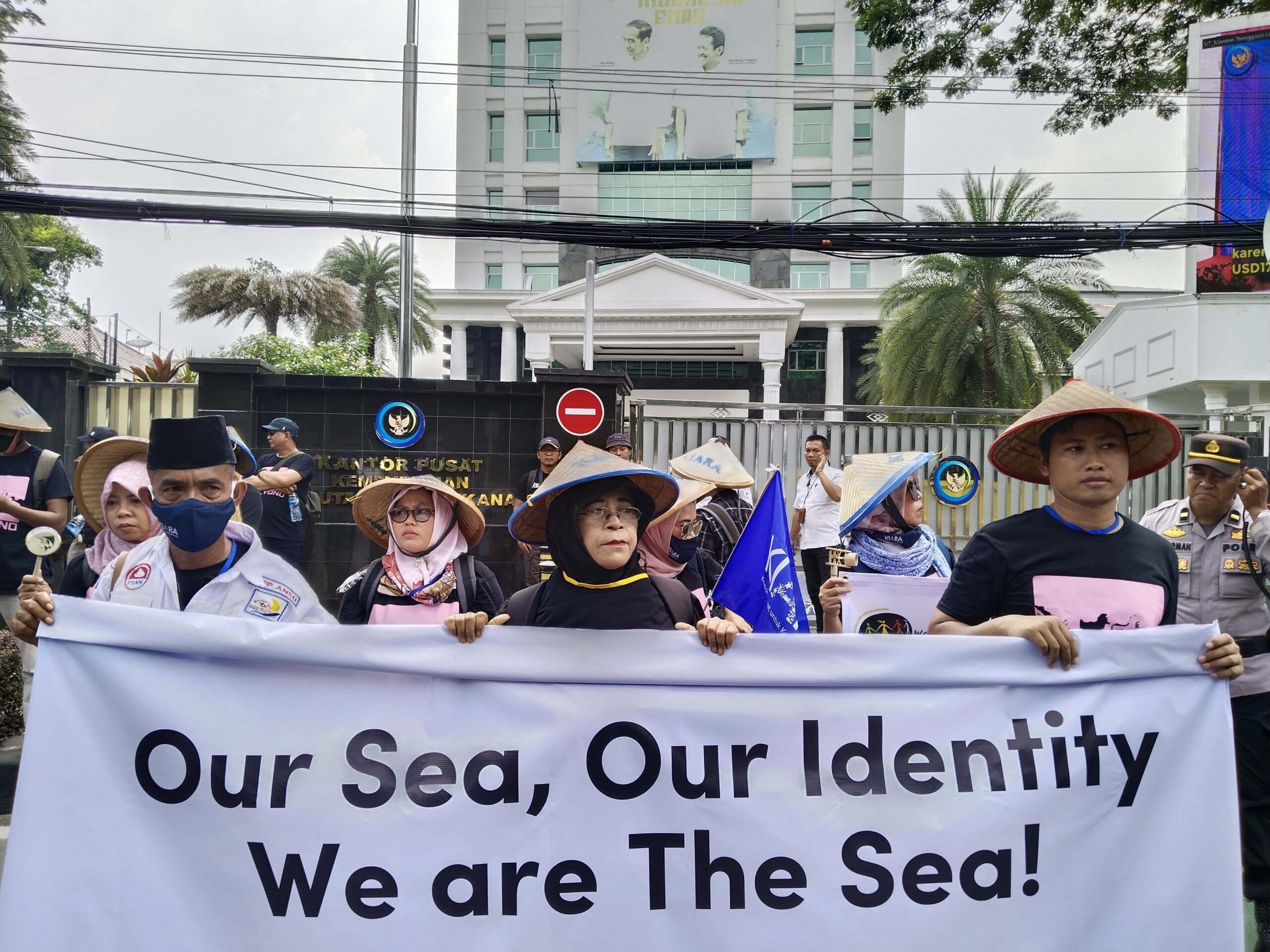 - Sejumlah nelayan dan masyarakat pesisir lain melakukan aksi menolak penambangan pasir di depan gedung KKP, Jakarta.