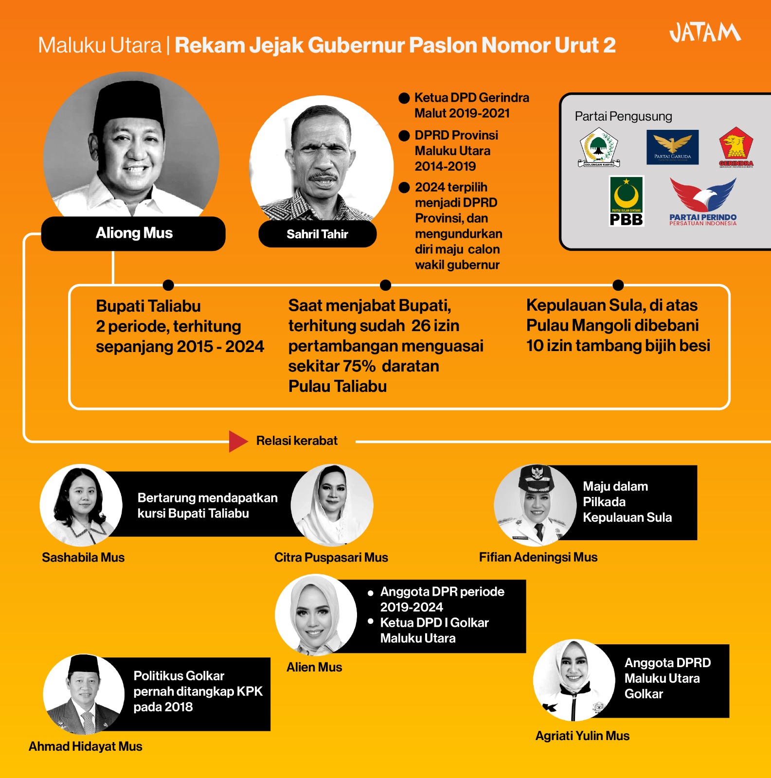 Ada pula Ahmad Hidayat Mus, politikus Golkar yang pernah ditangkap KPK pada 2018. Aliong Mus juga bersaudara dengan Agrianti Yulin Mus yang kini duduk sebagai anggota DPRD Malut dari Golkar.