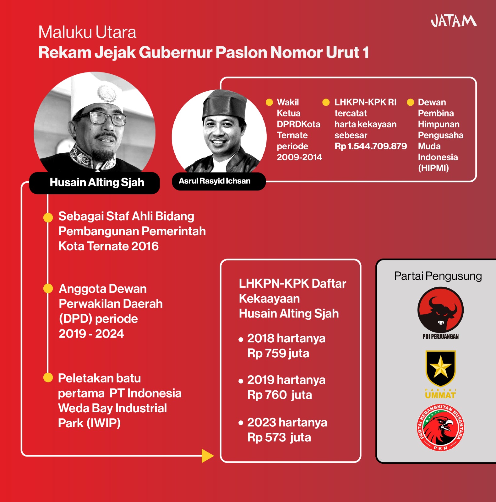Pasangan calon gubernur dan wakil gubernur nomor urut 1, Husain Alting Syah dan Asrul Rasyid Ichsan, diusung Partai Demokrasi Indonesia Perjuangan (PDIP), Partai Ummat, dan Partai Kebangkitan Nusantara (PKN). Husain Alting bergelar Sultan Tidore, pernah menjadi anggota DPD 2019-2024. Husain juga disebut satu tokoh yang terlibat dalam peletakan batu pertama pembangunan PT Indonesia Weda Bay Industrial Park di Teluk Weda.