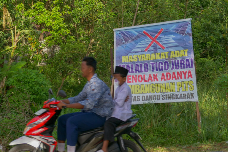 Beberapa spanduk penolakan terbentang di wilayah adat Malalo Tigo Jurai, Tanah Datar. Malin, tokoh pemuda adat mengatakan, PLTS masuk abai budaya setempat. “Ada ninik mamak, masyarakat. Jadi, tak sesuai adat berlaku. Sejak 2019, tidak ada bertemu ninik mamak,” katanya.