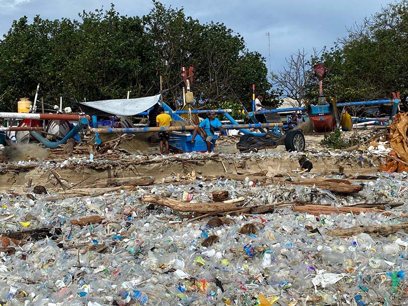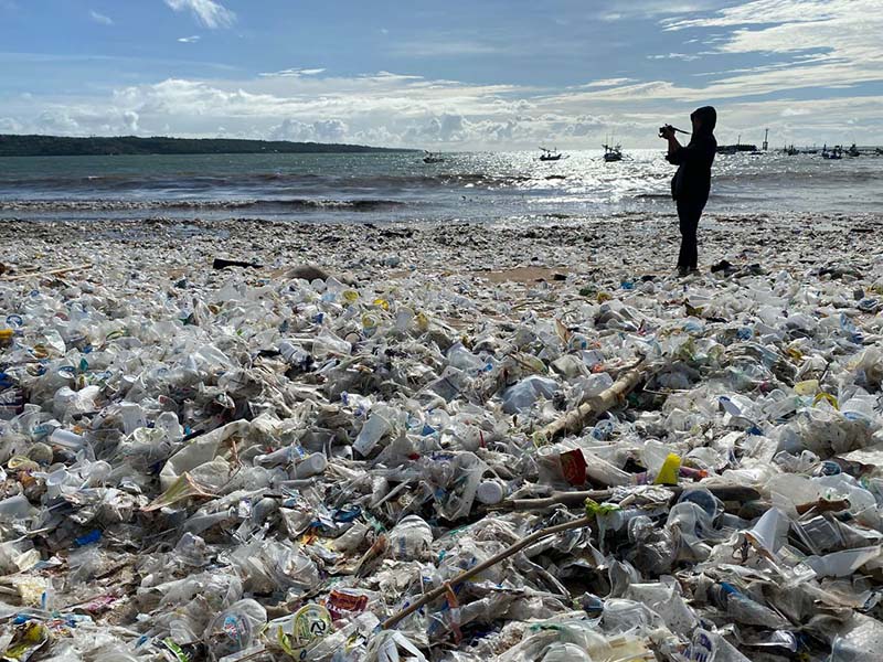 Pantai di selatan Bali dipenuhi sampah plastik dan kayu.