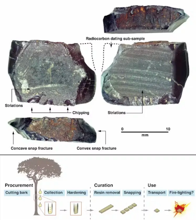 Seperti digambarkan dalam laporan tersebut, pertama, manusia di era itu mengumpulkan dari pohon dan mengalirkannya ke sebuah tempat. Setelah dibiarkan mengeras, dipindahkan lalu dipotong menjadi bagian lebih kecil sehingga mudah dibawa. Penggunaannya, antara lain untuk pembuatan api. Resin itu lebarnya 13,5 mm dan tebal 5 mm.