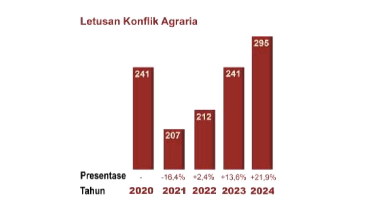 Konsorsium Pembaruan Agraria (KPA) mencatat, terjadi kenaikan 21% konflik agraria pada 2024 dibanding sebelumnya. Dari 241 kejadian pada 2023, menjadi 295 kasus. Konflik ini terjadi di atas tanah seluas 1.113.577,47 hektar dan berdampak pada 67.435 keluarga di 349 desa.