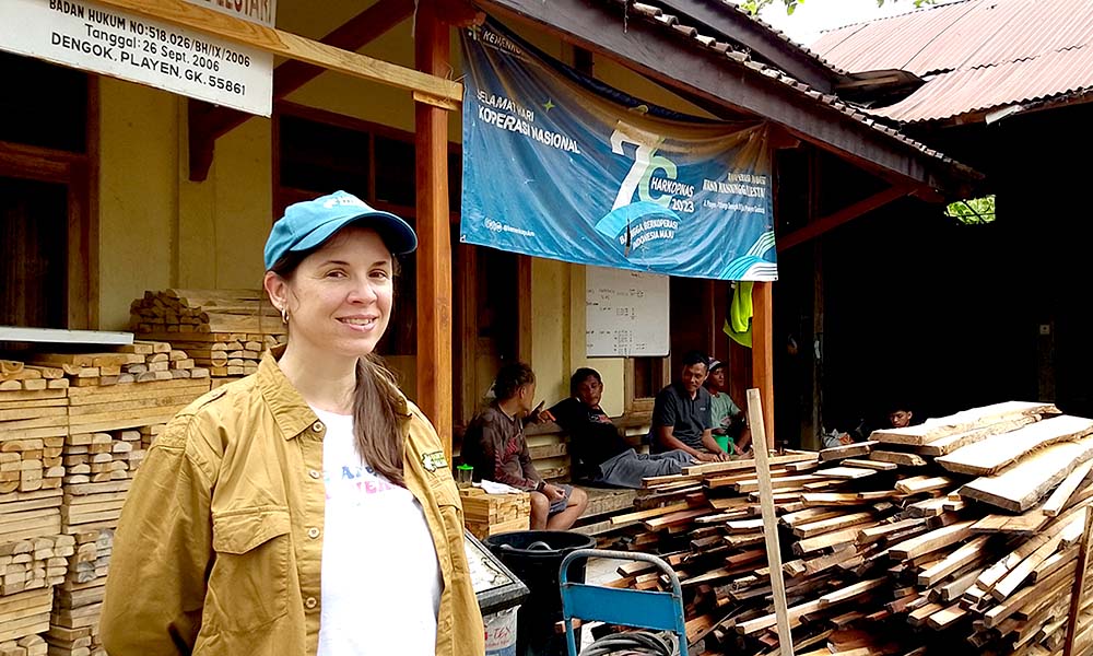 Ini merupakan kali pertama Virginia Foster, Direktur Frameworks and Landscapes Programs, Rainforest Alliance, mengunjungi Playen, Gunungkidul, Yogyakarta. Saat kakinya memasuki halaman kantor Koperasi Wana Manunggal Lestari (KWML), potongan dan serpihan kulit kayu sedikit merintangi jalannya.