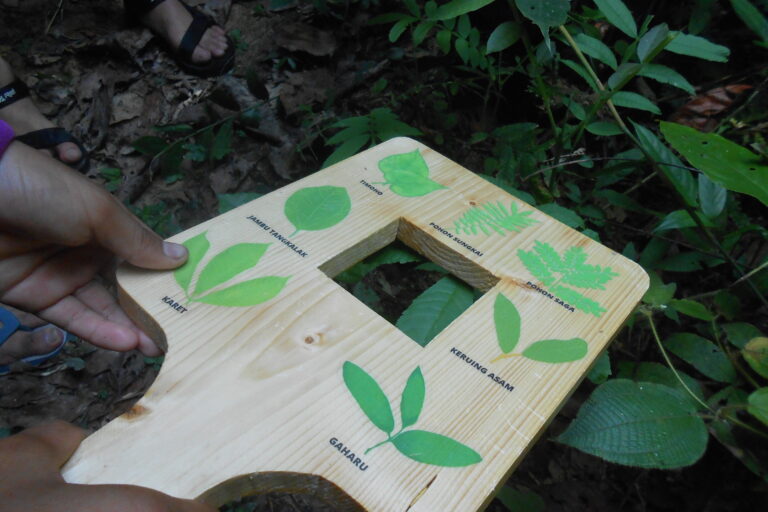 Jawaban mereka tak seragam. Salah satu yang sering dia temukan adalah keruing asam (Dipterocarpus). Pada papan interpretasi itu juga ada daun karet, jambu tangkalak (Bellucia pantamera naudin), timoho (Kleinhovia hospita L), sungkai (Peronema canescens), saga (Abrus precatorius) dan gaharu (Aquilaria malaccensis).