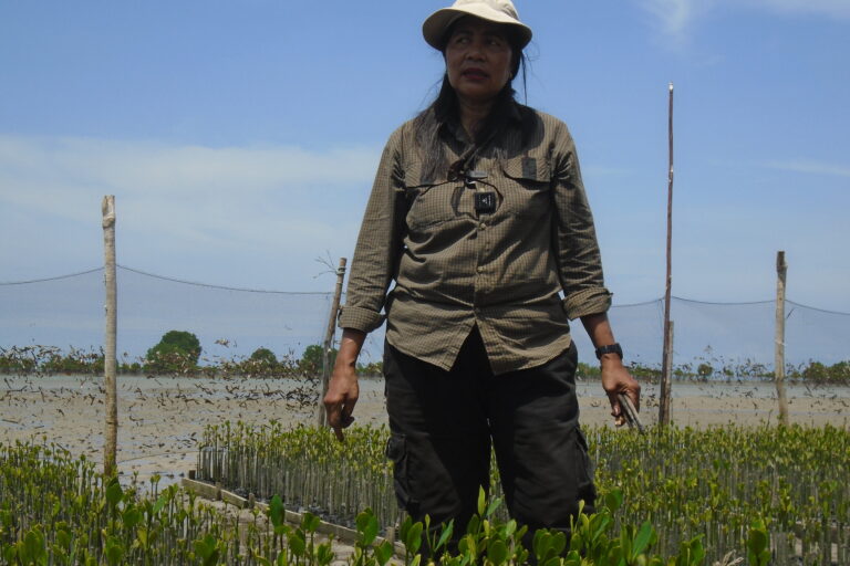 Ayu Narti, Ketua KUEP Tenggiri, antusias terlibat langsung mencari bibit, menyemai dan menanam mangrove. Dia ingin pantai di dekat rumahnya tetap terjaga dan tidak terkena erosi.