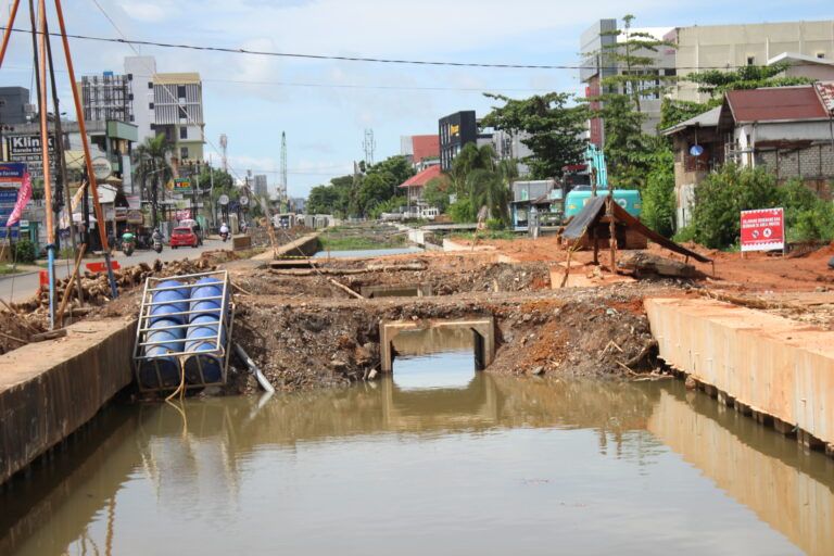 Untuk memastikan stabilitas bangunan di atas lahan basah, mereka memancang spun pile sebelum pembangunan rumah pompa. Juga, pembongkaran dan pembangunan ulang jembatan di Jalan Simpang Ulin agar sesuai dengan desain baru proyek.