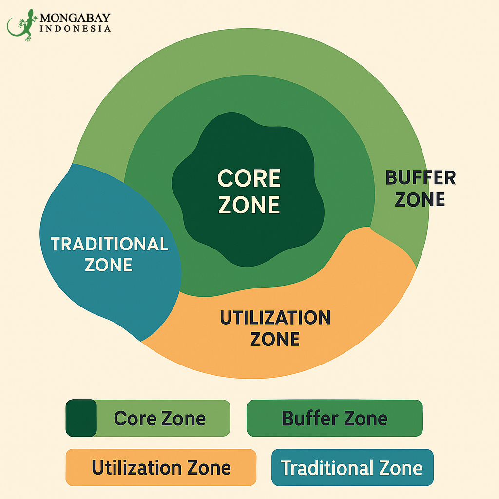 Kemudian, zona tradisional atau zona lainnya sesuai keperluan. Hanya masyarakat lokal yang boleh beraktivitas. Misal, pengambilan hasil hutan non-kayu sepanjang tetap lestari dan tidak merusak lingkungan.