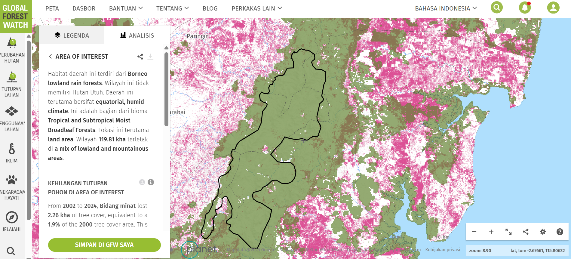 Praktik masyarakat adat melalui hutan keramat ini terbukti lewat analisis data Global Forest Watch. Dari 2002-2024, area di sekitar peta wacana TN Meratus hanya kehilangan tutupan pohon 1,9% dari total 2000.