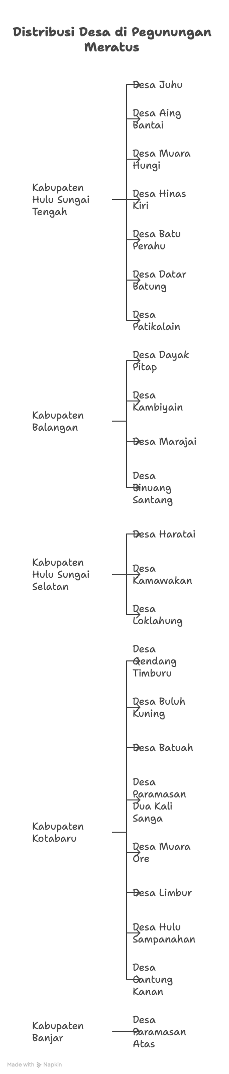 Data yang Mongabay terima dari pemerintah daerah maupun organisasi masyarakat sipil menunjukkan rencana TN Meratus mencakup area 119.779 hektar. Di dalamnya, ada puluhan desa di sembilan kecamatan dan 5 Kabupaten yang saling terhubung.