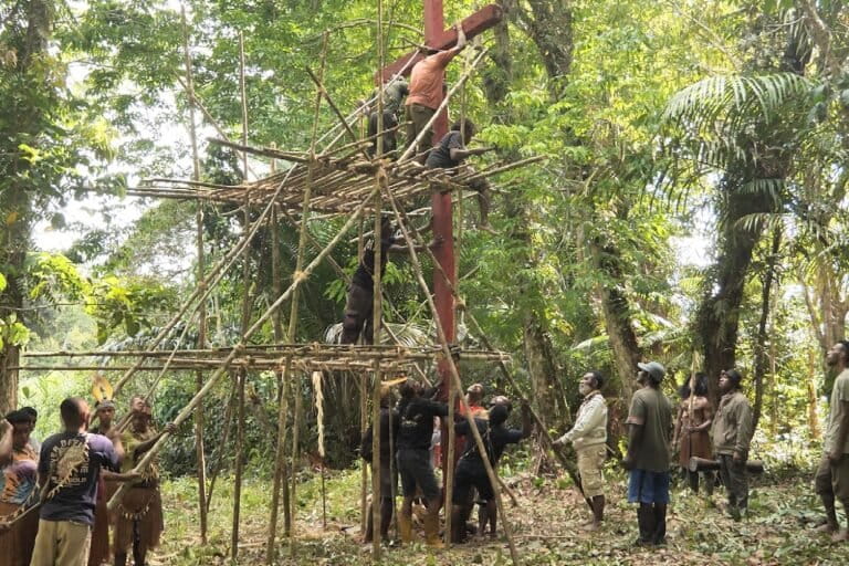 Puluhan warga dari Suku Awyu—perempuan dan lelaki—memakai aksesoris adat bahu-membahu menarik kayu salib berwarna merah. Sebagian mereka, mendorong kayu besar itu dari bawah, lalu memperkuat fondasi dengan rotan.