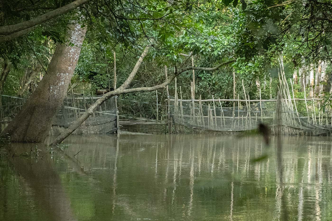 Di tepi Sungai Air Deras, kami menyeberangi sungai tersebut melalui sebuah pohon tumbang, untuk melihat sebuah lansatan. Lansatan adalah cara menangkap ikan dengan membuat jalur jebakan di arus sungai menggunakan dinding belahan bambu. Ikan yang terbawa arus, diarahkan pada sebuah tempat penampungan.