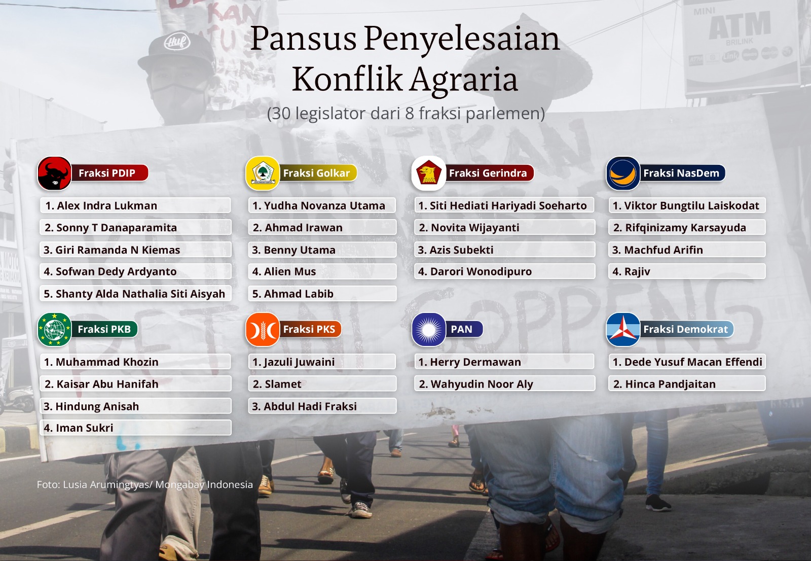 - Akhirnya, DPR membentuk Panitia Khusus Penyelesaian Konflik Agraria pada 2 Oktober lalu. Pansus ini berisi 30 anggota DPR dari delapan partai politik. Harapannya, pansus dapat menangani 24 masalah struktural agraria yang mengakibatkan penjarahan tanah dan air secara sistematis.