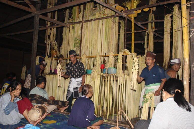 Balai Impun Desa Haruyan Dayak, Kecamatan Hantakan, Kabupaten Hulu Sungai Tengah, Kalimantan Selatan, riuh manusia, Sabtu (27/9/25). Sepanjang malam itu, Balian, perapal mantra, komat-kamit dengan iringan dentuman gendang. Mereka melakukan ritual aruh ba’wanang, merayakan kehidupan lewat pesta panen padi sebagai wujud syukur kepada Hyang Dewata Langit.