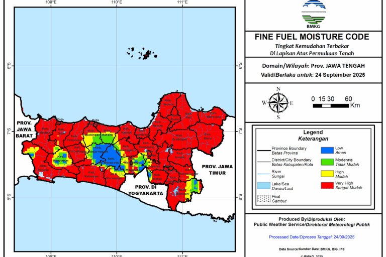 Data FFMC yang BMKG rilis 24 September menunjukkan hampir seluruh Jawa Tengah berwarna merah. Menandakan waspada kebakaran. Hanya kawasan Pegunungan Dieng yang warna hijau, atau relatif aman.