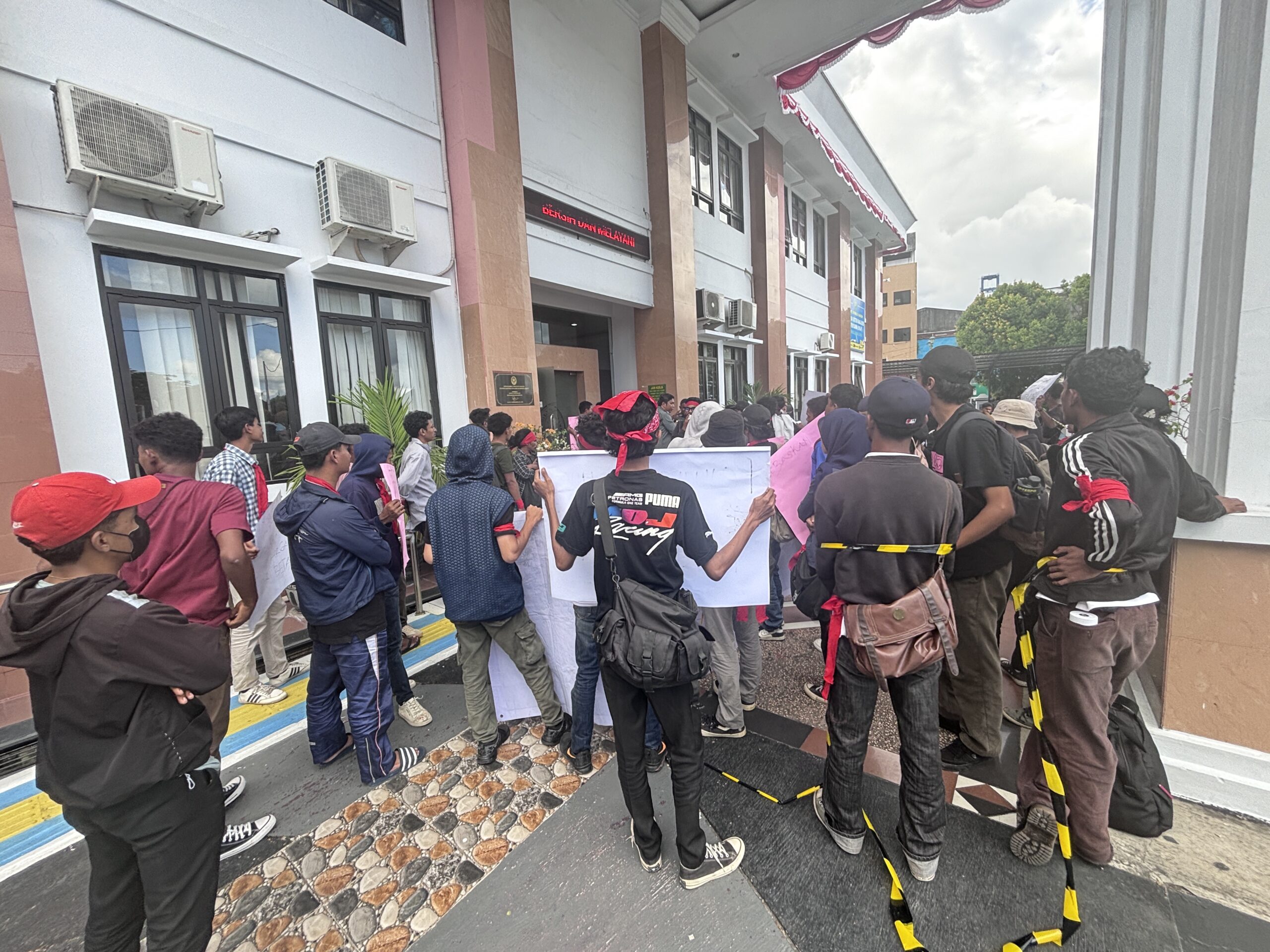 Sore itu, halaman PN Ambon berubah menjadi lautan massa dari Aliansi Baku Jaga Tanah. Mereka juga bawa spanduk bertuliskan: