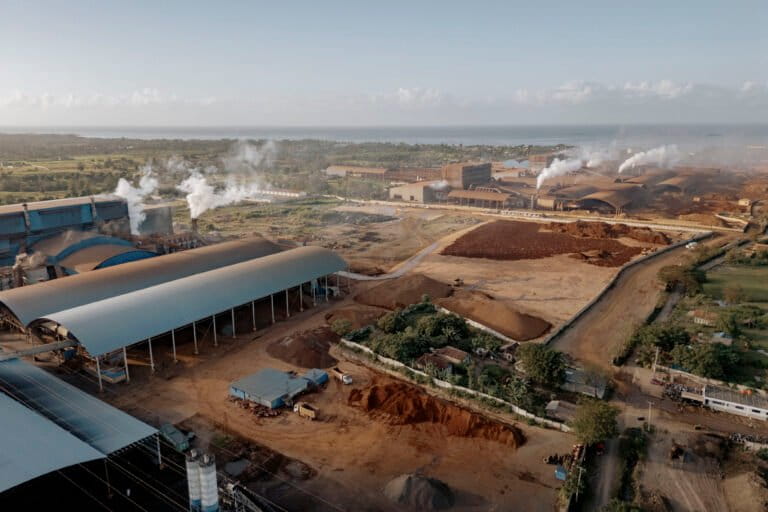 Cerobong asap pabrik pemurnian nikel di KIBA tak pernah berhenti. Debu halus dari sisa pembakaran menyelimuti kampung di sekitar kawasan.