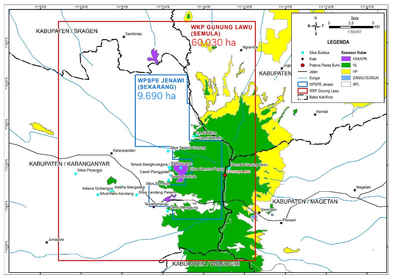 Proyek wilaya panas bumi yang sudah pemerintah hapus seluas 60.030 hektar. Area PSPE Jenawi berada di wilayah yang sama, dengan luas lebih kecil dan terletak di tengah proyek lama.