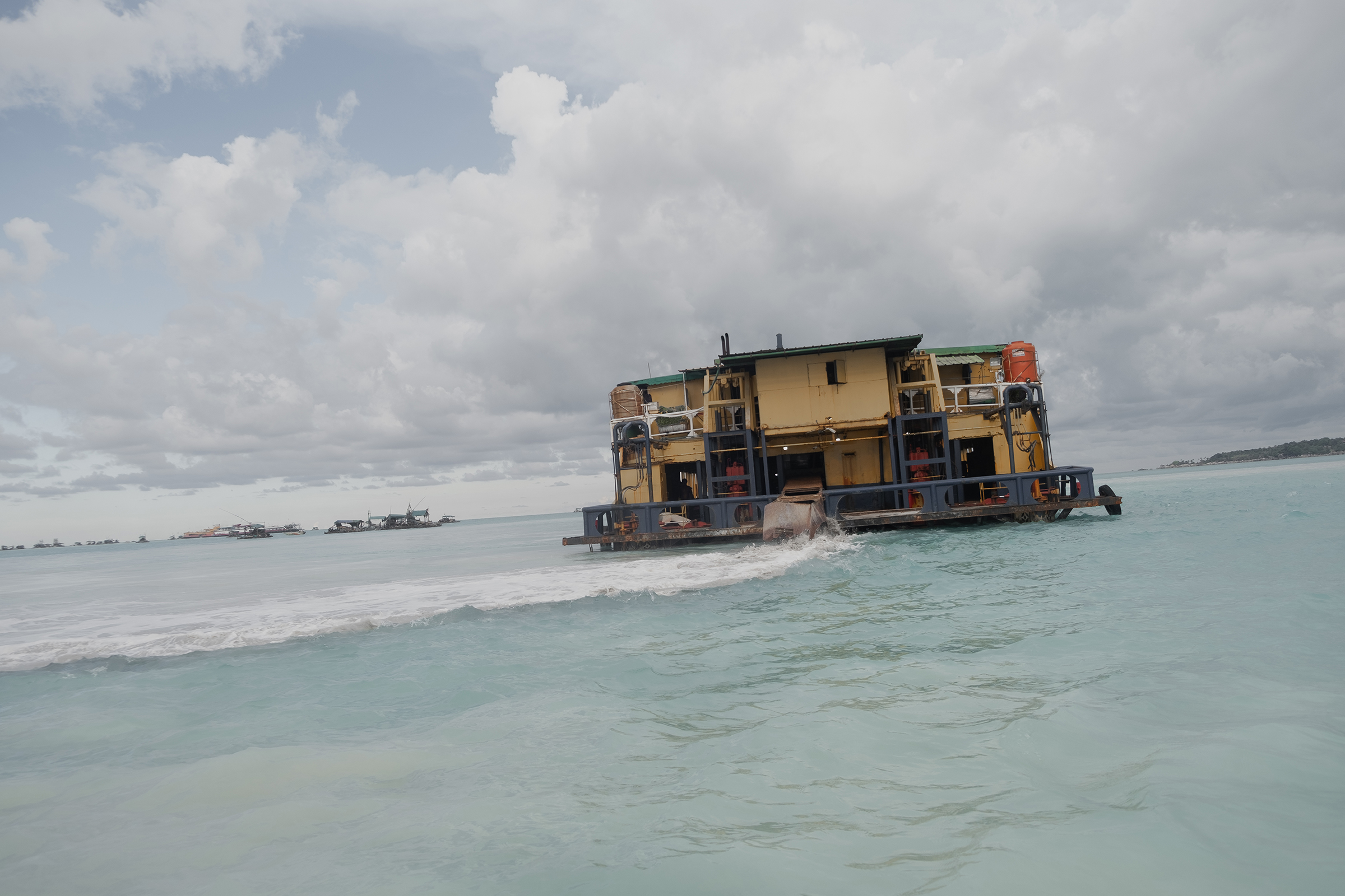 Ponton-ponton dengan mesin pengisap timah tertambat di tepian pantai Laut Tanjung Ru, Desa Bakit di Pulau Bangka. Titik ini merupakan salah satu pusat penambangan timah lepas pantai di Pulau Bangka, lebih sunyi dari biasanya.