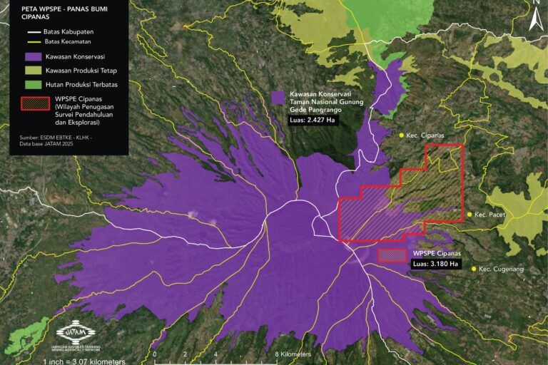 Catatan Jatam, Gunung Gede Pangrango berstatus taman nasional, yang memiliki fungsi pelestarian dan perlindungan sumber daya alam sejak 1980, dan sudah menjadi zona inti Cagar Biosfer ditetapkan UNESCO pada 1977.