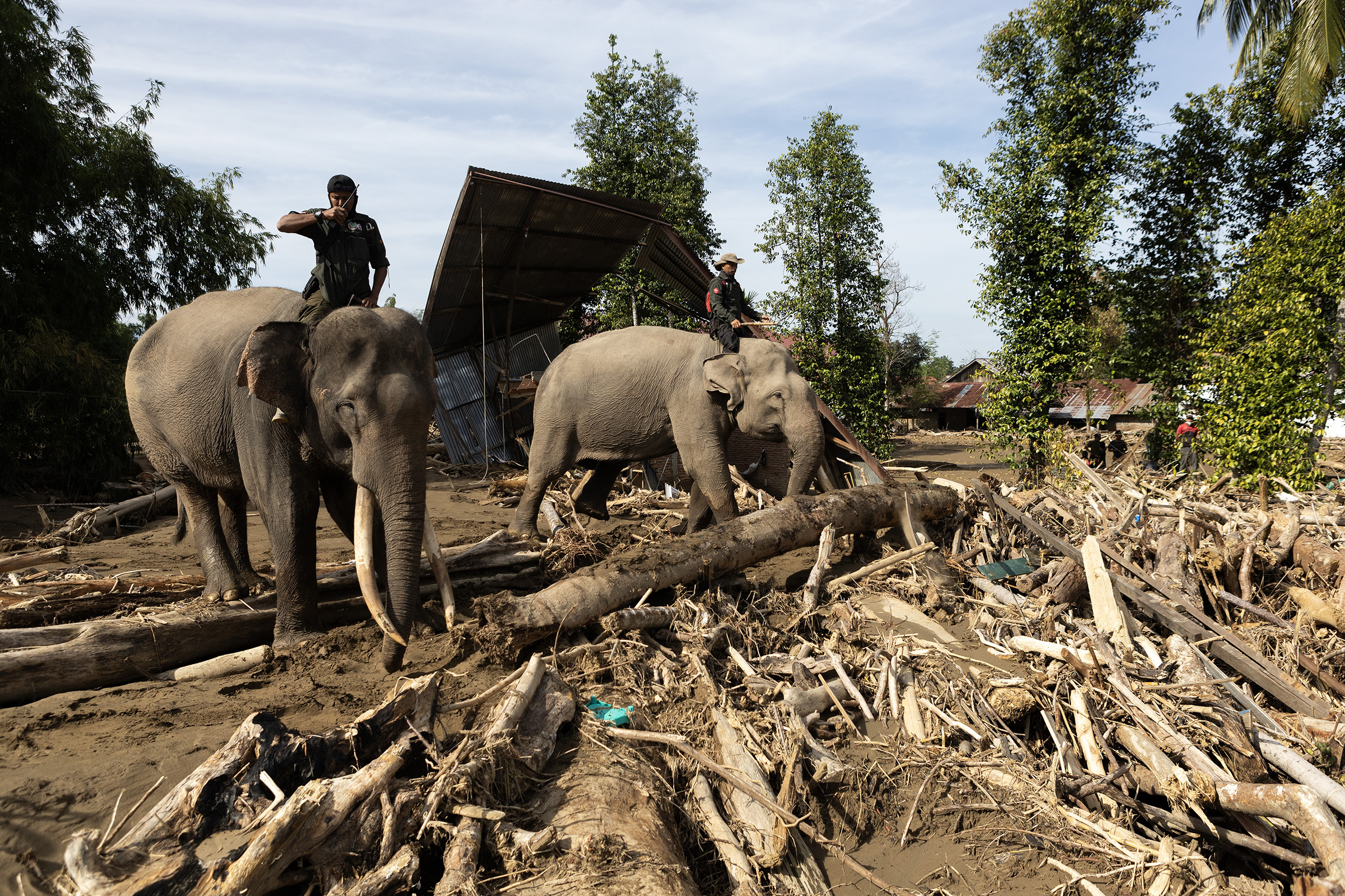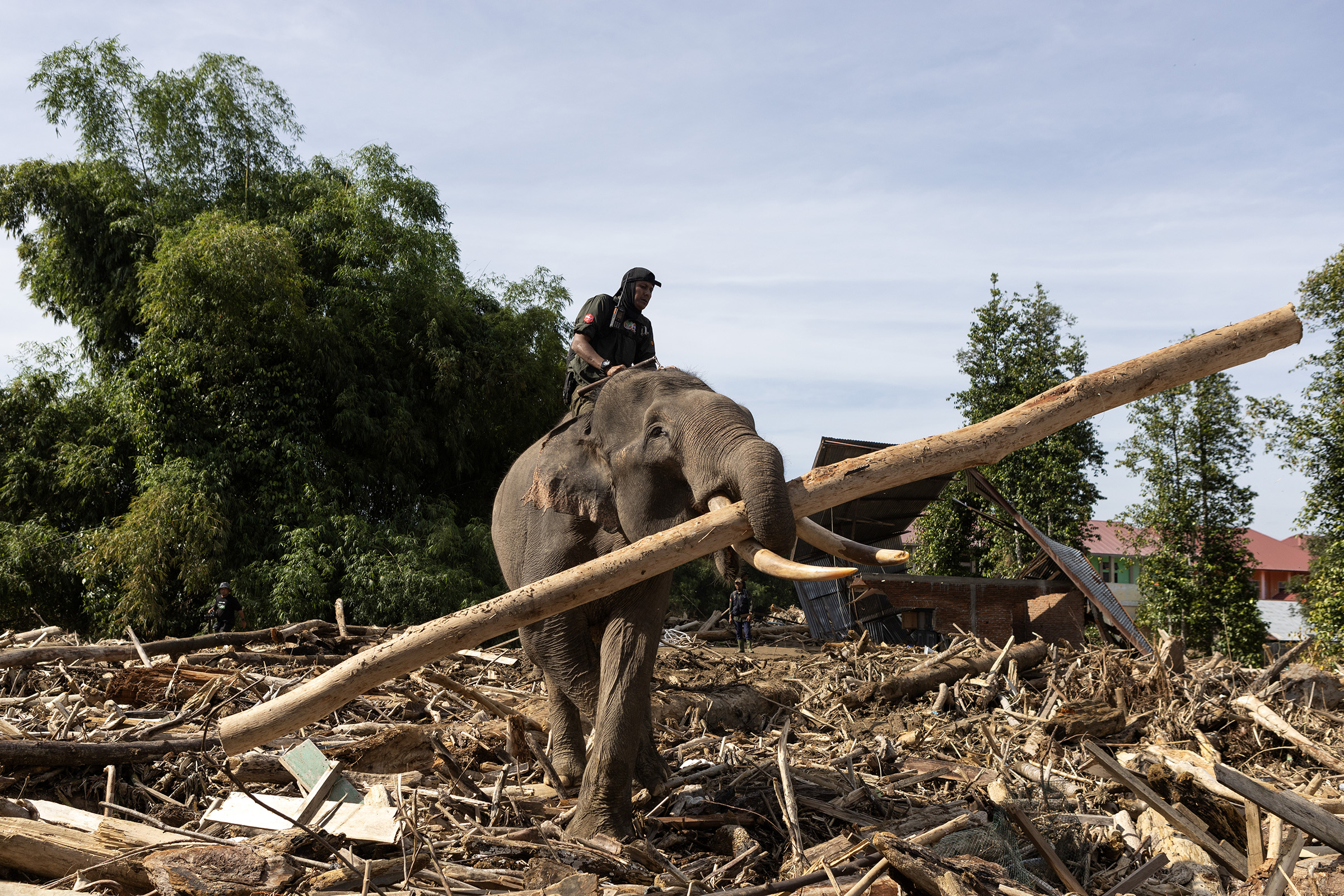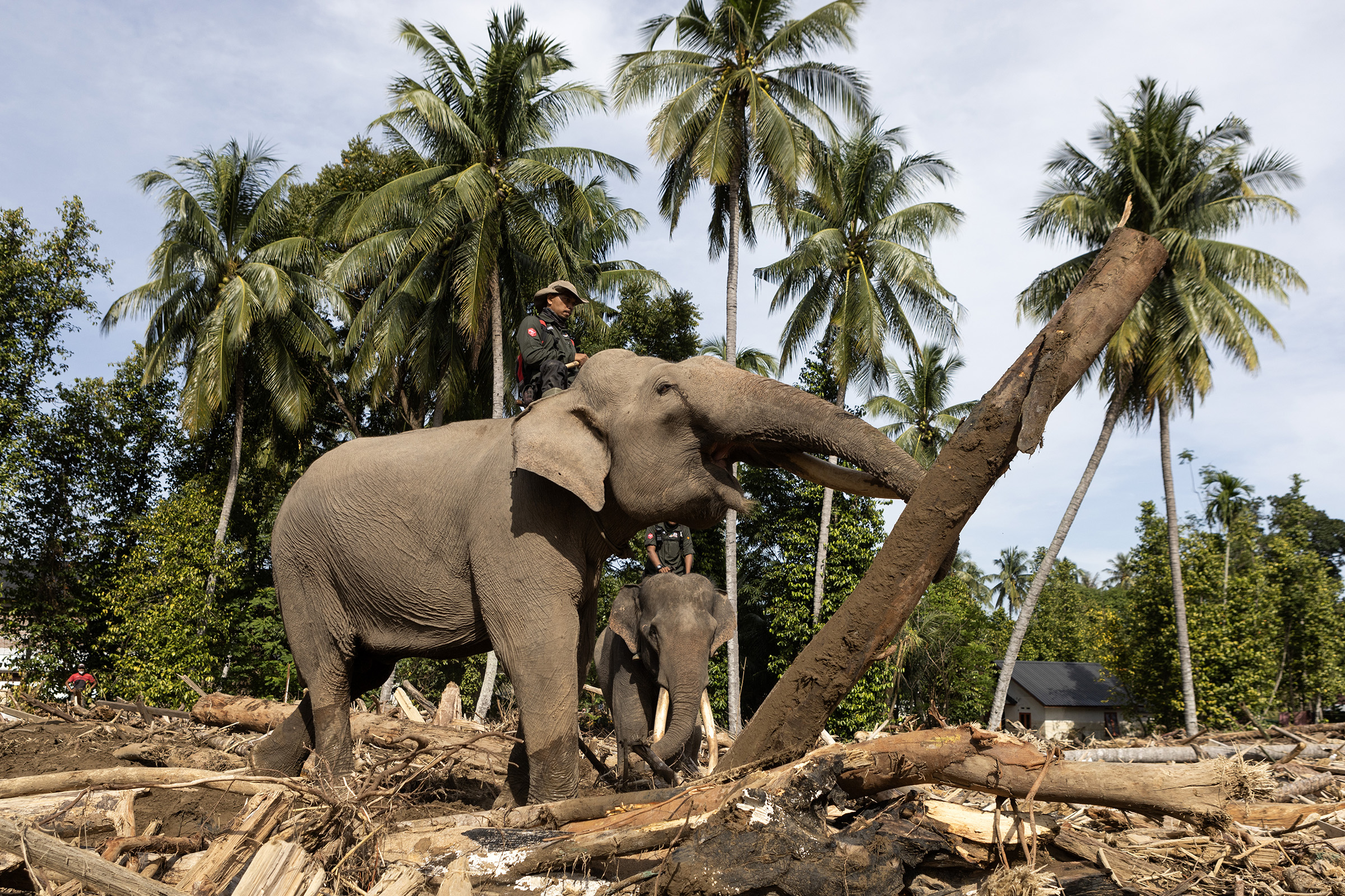 “Mereka gajah terlatih dan berpengalaman dari Pusat Latihan Gajah (PLG) Saree, Kabupaten Aceh Besar. Mereka dipandu mahout yang sangat paham karakteristik gajah dan bertugas menarik batang kayu besar yang tersangkut di rumah warga serta membuka akses jalan yang tertutup material banjir,” terang Ujang Wisnu Barata, Kepala BKSDA Aceh, Minggu (7/12/2025).