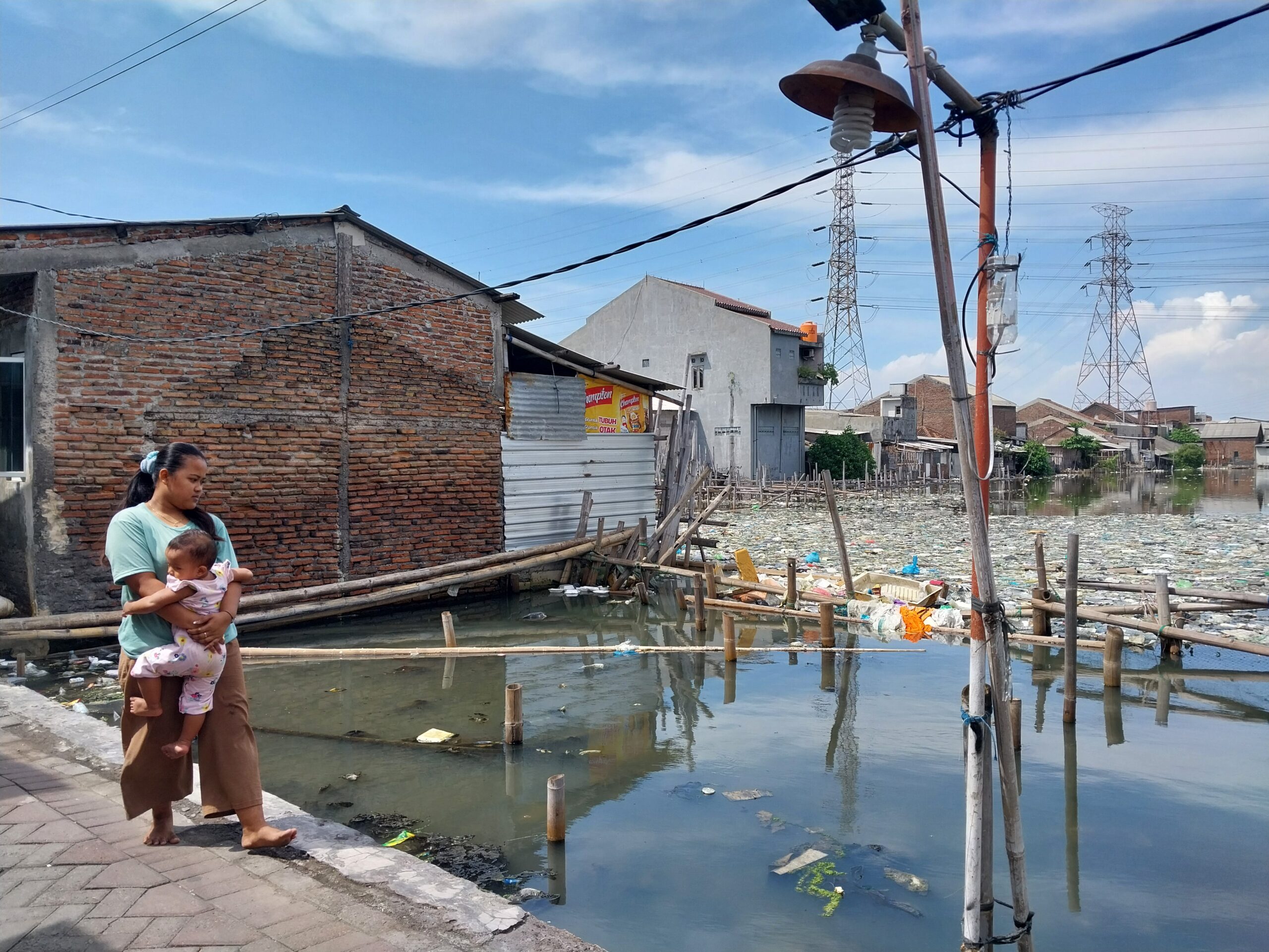 Bau menyengat menusuk hidung saat memasuki kawasan pesisir Tambakrejo, Kelurahan Tanjung Mas, Semarang, Jawa Tengah (Jateng). Seolah tak merasa terganggu, Maisaroh (25) tampak tenang menggendong anaknya yang masih bayi.