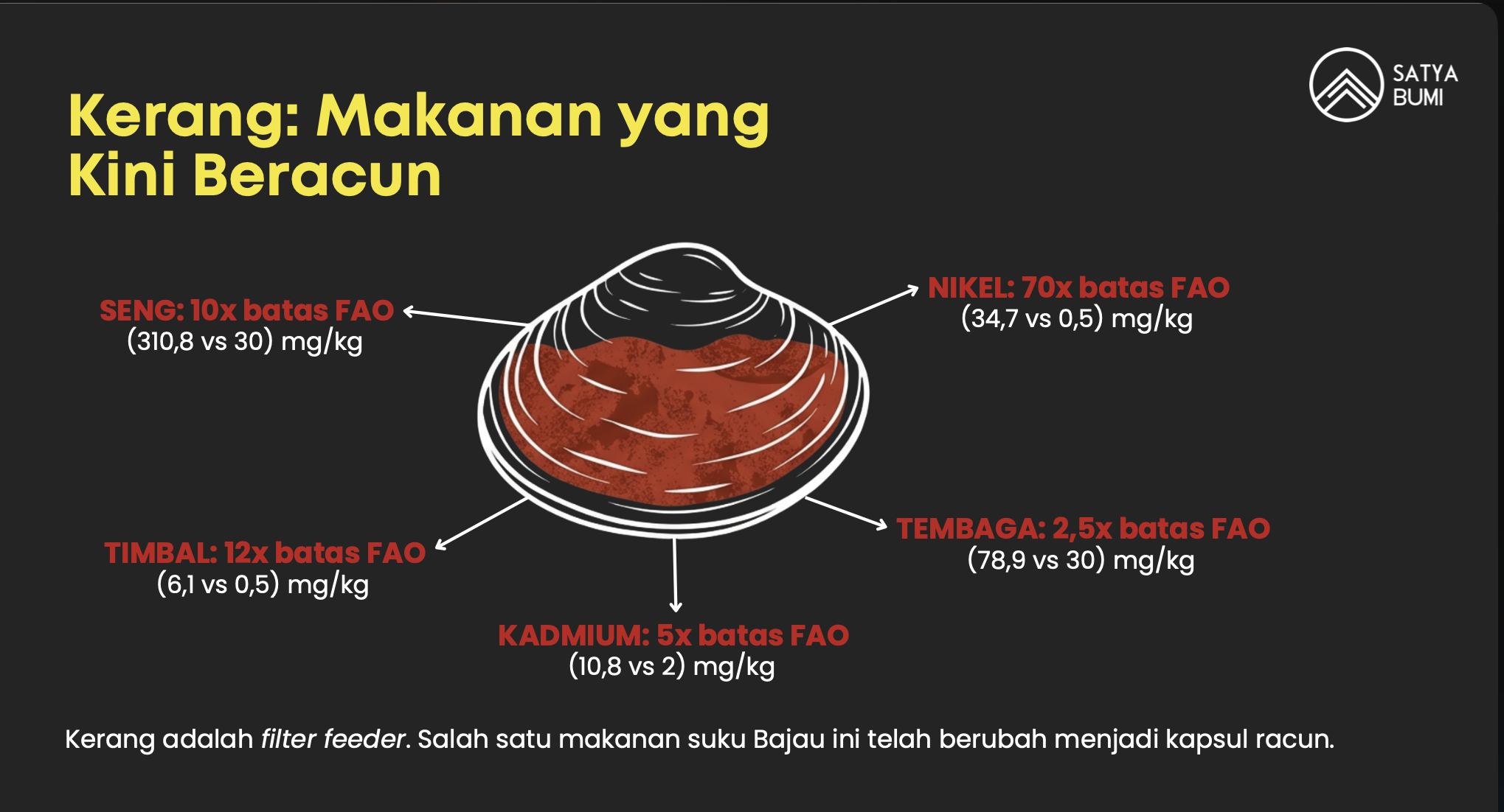 Kathrin Schilling, peneliti kesehatan lingkungan dari Columbia University, menyebut kerang “bioindikator alami,” karena organisme ini menyaring air laut dan mengakumulasi zat berbahaya di tubuhnya. Ketika kerang tercemar logam berat, manusia yang mengkonsumsinya turut terpapar.
