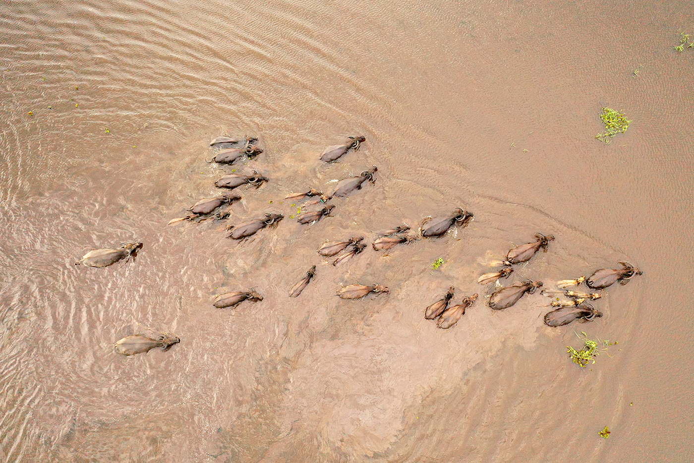 “Kerbau rawa sangat suka berendam. Tujuannya, untuk menurunkan temperatur tubuhnya. Penyerapan panas terjadi karena warna kulitnya yang hitam,” jelas Yude.